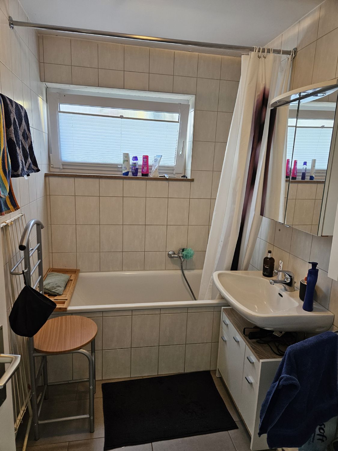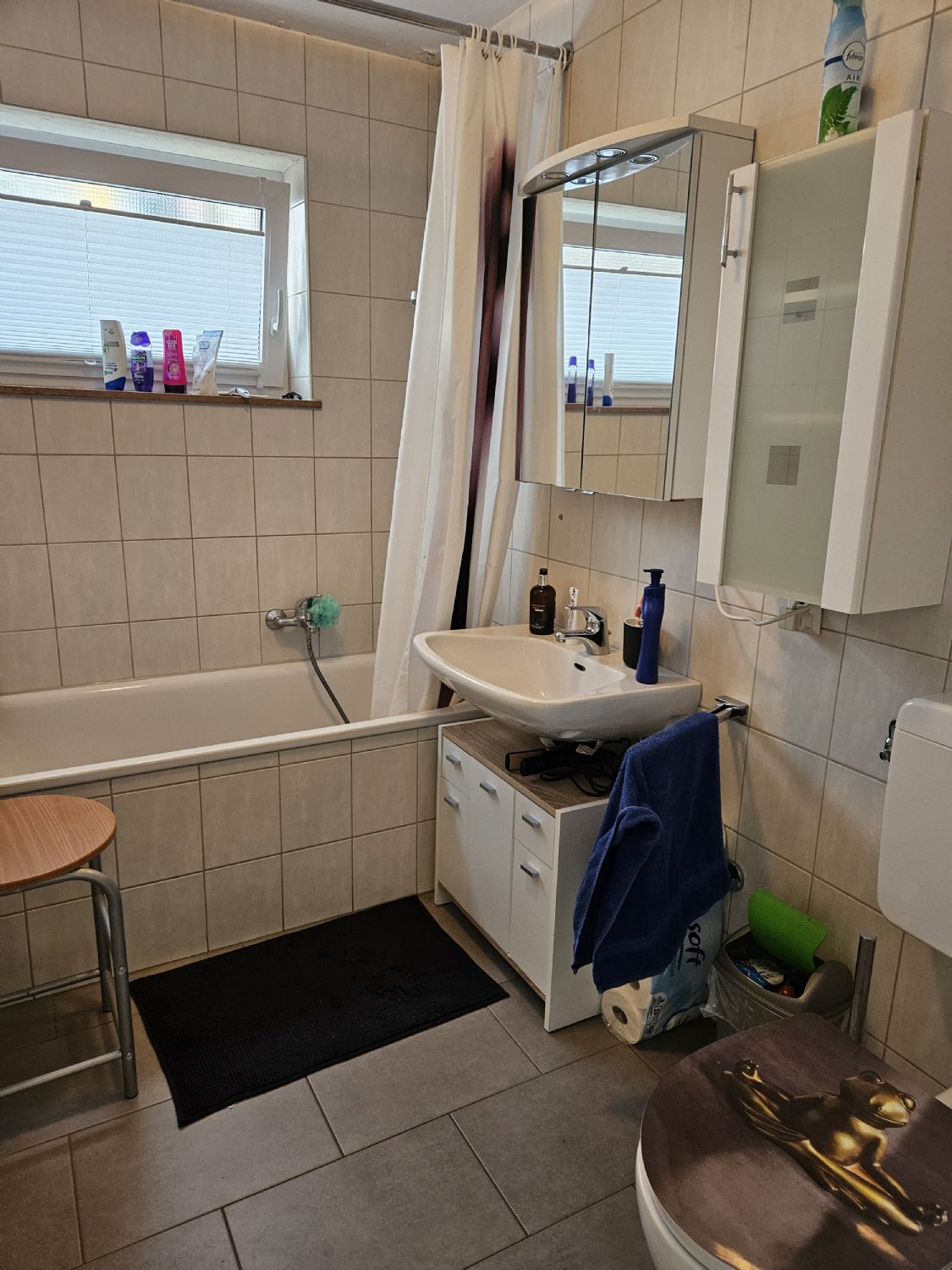Tageslicht-Badezimmer mit Waschtisch, Badewanne und WC